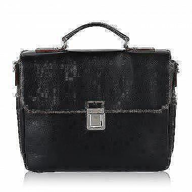 Классический деловой портфель — универсальный вариант для бизнес-поездок и офисных будней. Черный аксессуар из гладкой натуральной кожи закрывается с помощью откидного клапана на традиционном замке. Просторное внутреннее отделение располагает набором из пяти карманов, включая карман для ноутбука и карман на молнии. Снаружи по бокам размещены два вертикальных кармана на молнии, а большой открытый карман примыкает к задней стенке. В комплект входит регулируемый наплечный ремень.
